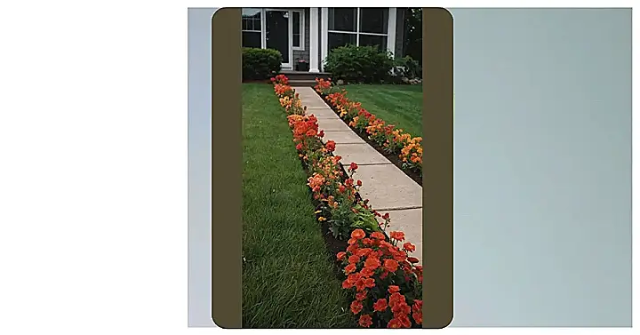 This picture shows a beautiful pathway leading up to a house, and it’s lined with flower beds on either side. Imagine walking up this path – it’s like you’re stepping into a rainbow! The orange and yellow flowers on either side are bursting with color, and they make the whole scene look really inviting and happy. It’s like a giant floral welcome mat!