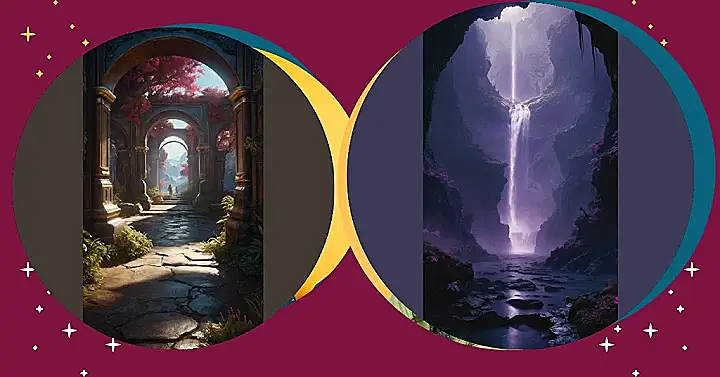 This image is like a seriously cool wallpaper for your phone or computer. It’s got this epic stone archway, all mysterious and ancient-looking, like something straight out of a video game or a fantasy novel. Imagine it: you’re a brave adventurer, ready to explore a hidden world beyond that gateway! There’s even a spooky moon peeking through the cave ceiling, casting magical shadows everywhere. Who needs boring old pictures of cats when you can have this amazing portal to an imaginary land?