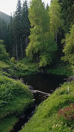 The best part? This place is probably super lush all year round! Those evergreen trees just keep on growing, even in the winter when it’s cold and snowy. So even when it’s chilly outside, this place is still green and beautiful. It’s like a little secret haven for all the animals who live in the forest. They can come here to drink, play, and hide from the other animals. It’s a real little paradise, tucked away in the green embrace of the forest.