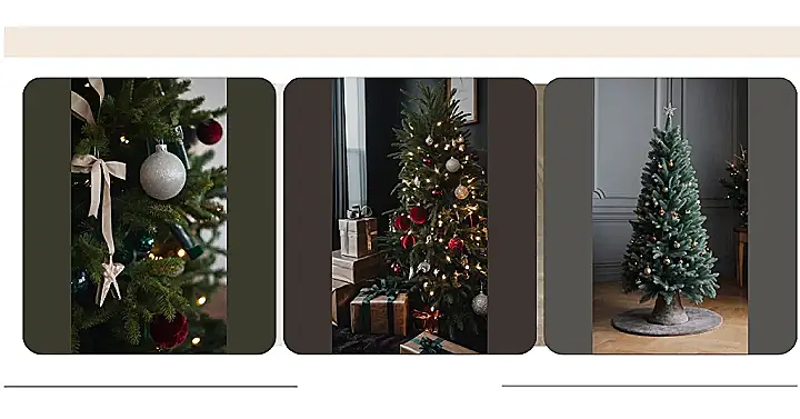 The tree is also decorated with some really unique and pretty bow ribbons – one is a big, flowing cream ribbon tied into a gorgeous bow, and the other looks like it’s made of a soft, velvet fabric. Together, they really add a special touch to the Christmas tree, making it look like something out of a dream. Just imagine sitting under this tree with a hot chocolate, opening presents, and feeling the magic of the holidays!