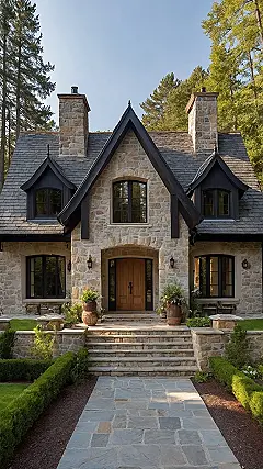 Just look at those massive stone chimneys! They probably churn out smoke signals that smell like fancy pastries. The steps leading up are so grand, you feel like you should be arriving via horse-drawn carriage, not just walking up after getting the mail. It’s the kind of house that makes you want to put on a striped shirt and spontaneously start yodeling… or maybe just admire the fancy stonework and wish your own house had a roof this cool.