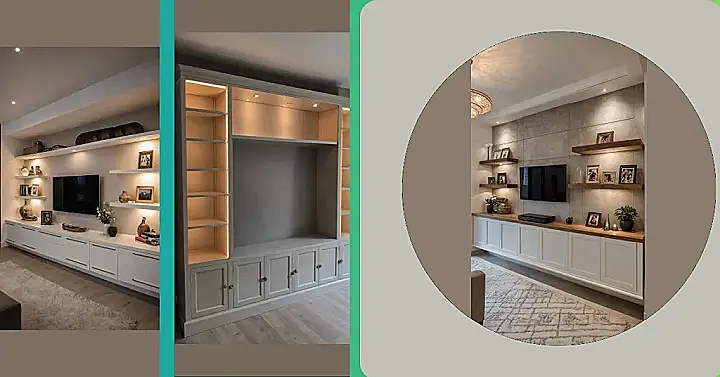 These cupboard and shelf combos aren’t just for stuffing things away; they actually make your room look awesome! The design in the photo isn’t just a boring box; it’s a whole feature wall that holds your TV and turns your clutter into decoration. It’s like giving your living room a stylish makeover where everything has its own little spot, from your favorite framed photos to a trailing plant that looks like it’s trying to escape. It’s the perfect way to go from “help, my living room ate my homework” to “wow, my living room is actually kinda cool.”