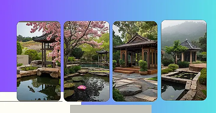 Imagine this: you’re totally stressed about that upcoming history test, right? Suddenly, you stumble upon this ridiculously peaceful garden. There’s a gorgeous little pagoda-looking thing sitting serenely over a pond full of lily pads, like it’s posing for a magazine cover. Pink flowers are popping out everywhere, it’s like a floral explosion but in a calm, collected way. This serene garden design is so chill, even your grumpy grandpa would probably crack a smile – maybe even offer you a cookie.