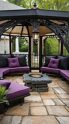 This gazebo isn’t just a place to hang out; it’s a mini-castle of comfort! Imagine sinking into those plush purple cushions, surrounded by the intricate, black metalwork that looks like something straight out of a fairytale. The fire pit in the center? That’s the perfect touch for those chilly evenings, turning your backyard into a cozy kingdom where you can roast marshmallows and tell spooky stories (or just chat with friends, that’s cool too!). It’s the ultimate in gazebo ideas and designs, blending elegance with relaxation.