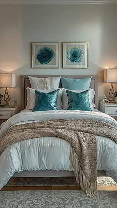 This bedroom isn’t just relaxing; it’s a total vibe! Imagine sinking into that cloud-like bed after a long day. The colours are so calming, it’s like someone painted the room with a giant brush dipped in a milkshake and a rainforest! That huge painting above the bed looks like someone splattered gorgeous teal flowers across a canvas – perfect for daydreaming about faraway lands or simply drifting off to sleep. Seriously, who needs a sheep to count when you’ve got this gorgeous oasis?