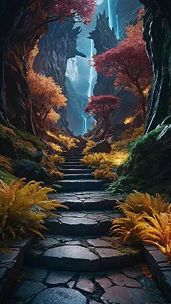 This picture is like stepping into a video game – or maybe a really cool dream! Imagine walking up those mossy stone steps, surrounded by glowing ferns and trees that look like they’re straight out of a fantasy novel. The waterfall in the distance adds a magical touch, like it’s leading to a hidden kingdom of elves or talking animals. It’s the perfect image for a fantasy worlds wallpaper because it feels both mysterious and inviting, making you want to explore every nook and cranny of this amazing place.
