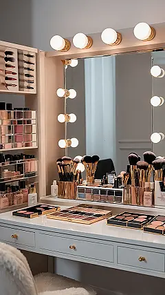 Step into this dream makeup space and tell us you don’t immediately feel like a celebrity getting ready for a red carpet event! That incredible mirror with its halo of light isn’t just for looking good; it’s practically a spotlight for your next masterpiece, ensuring no makeup blunder ever stands a chance. And just peek at all those brushes and glosses, lined up like a perfectly disciplined army, ready to help you conquer the day (or at least your school selfie game). It makes our own grab-bag of forgotten lipsticks feel a little bit jealous, doesn’t it?