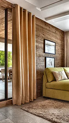 Sometimes, home decorating feels like trying to solve a puzzle where all the pieces are different shades of beige, but this room totally nails it! Check out those amazing, floor-to-ceiling curtains – they’re not just hanging there looking pretty, they’re basically ninjas of privacy and sun protection, ready to swoop in and save your weekend sleep-in. And don’t even get me started on the wood panel wall; it’s got that cozy, ‘Netflix and chill’ vibe without actually being a log cabin. Who knew making your space look good could be this effortlessly cool?