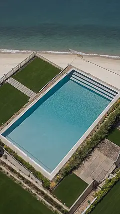Imagine this: you’re chilling by a sparkling pool, the sun’s shining, and the ocean is just steps away! That’s exactly what this picture shows – awesome pool landscaping right on the beach. It’s like someone decided a regular backyard just wasn’t fancy enough, so they built an amazing pool practically in the sand! The lush green grass and neat pathways add the perfect touch, making it look like a magazine cover come to life. Who needs a boat when you’ve got this incredible view from your very own pool deck?