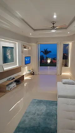 This living room is basically a real-life Pinterest board come to life! The light colors and sleek furniture make it feel like a magazine spread, but the giant windows overlooking a tropical paradise are the real showstoppers. It’s like they’re saying, “Hey, we’re cool and trendy, but we also know how to relax and enjoy the view.” I bet hanging out in this room feels like a mini vacation every day!