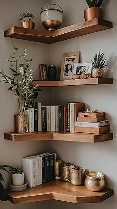 You know how sometimes a room has those totally awkward corners, just kinda chilling there, not doing much? Well, these corner shelves are like the ultimate glow-up for those neglected spaces! They magically transform a boring wall junction into the coolest display zone in the house. It’s like finding a secret superpower for your room, turning what used to be empty air into prime real estate for all your coolest knick-knacks and greenery, proving that even a corner can be a star.