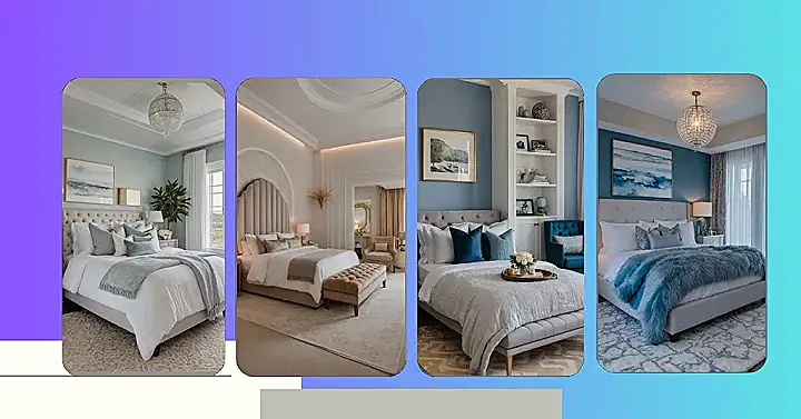 But wait, there’s more! This isn’t just a blue room; it’s got that “moody” vibe that makes you feel instantly fancy. Check out that chandelier – it’s practically screaming ‘royal slumber party!’ And those fluffy white pillows? You know they’re just waiting for you to swan-dive onto them. Even the shaggy rug looks so cozy, you might accidentally forget your slippers and just sink your toes in. Plus, that tall green plant is totally pulling off the ‘sophisticated jungle’ look without getting actual dirt on the pristine carpet. This room isn’t just a place to sleep; it’s a whole luxurious escape, perfect for when you need to feel like a high-class nap enthusiast.