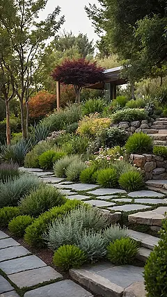 It’s like this garden has a personal stylist who makes sure every leaf is perfectly coiffed and every flower is blooming on schedule. I bet the person who owns this place has a secret handshake with their plants, because mine usually just glare at me when I forget to water them. From the cool, silvery bushes to the vibrant green ones that look like giant fuzzy pom-poms, this home garden proves that with enough care (and maybe a touch of magic), even a sloped hill can become a vibrant, living artwork that makes you want to ditch your screen time for some serious chill time.