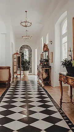 Walking into this hallway feels like stepping onto a giant, super-fancy chessboard! Seriously, with those sharp black and white diamond tiles, you might just get the urge to prance down the corridor pretending you’re a knight, or maybe even a majestic queen surveying your domain. It’s got that old-school cool vibe, like a place where secret passages could totally exist behind one of those ornate gold mirrors and dramatic plants. Just try not to get distracted by the urge to play chess with your feet when you’re supposed to be grabbing a snack!