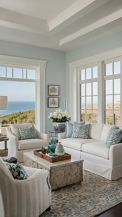 Check out the details, though! That coffee table looks like it has some cool stories, maybe even a secret compartment for beach snacks. The pops of blue on the pillows and vases are like little waves of style scattered around, making the whole place feel fancy but still totally laid-back. It’s the perfect mix of looking super put-together but also saying, “Yeah, come in, kick back, maybe just don’t track in actual seaweed.” This is coastal living leveled up, where flip-flops are optional but feeling instantly calm is not.
