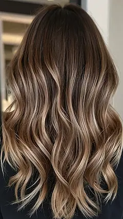This hairstyle is like a secret message whispered by the sun – dark, rich brown locks get playfully kissed by lighter highlights, creating a cascade of gorgeous waves that would make even a mermaid jealous! It’s totally stunning, and the best part? It’s super low-maintenance, meaning you can spend more time doing things that are way more fun than fussing over your hair. Imagine spending your Friday night binge-watching shows instead of wrestling with your hairbrush—now that’s a win!