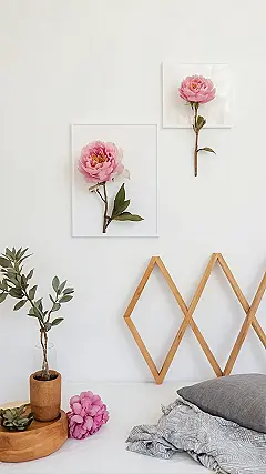You know how sometimes your room just screams ‘blank canvas’ and you’re not sure where to start? Well, check out this wall! It’s got those cool framed pieces that look like they’ve captured a secret garden moment – one’s a delicate flower, and the other’s like a super cool, spiky dandelion gone chic. And then, boom! A bunch of fresh, white flowers just casually chilling between them, making it look effortlessly elegant. It’s like the walls decided to host a fancy botanical party, and everyone’s invited to stare at how awesome it looks instead of, you know, doing chores.