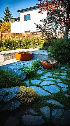 This isn’t just a backyard; it’s a full-blown outdoor adventure waiting to happen! Forget endless, boring lawns where the only excitement is watching the grass grow. Here, someone clearly decided their outdoor space deserved a serious glow-up. Peeking at those funky, irregular stepping stones winding through the grass, you can almost hear them whispering, “Follow me to the chill zone!” They lead you right to a swanky stone patio, perfect for kicking back, maybe doing some homework (or, let’s be real, scrolling TikTok) in the sun.