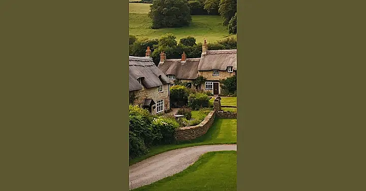 The picture shows a cute little cottage nestled in the heart of a lush English village. Imagine waking up to birds singing and the smell of freshly baked bread coming from the local bakery. This little house is like a dream come true for anyone who loves charming villages and peaceful countryside.
