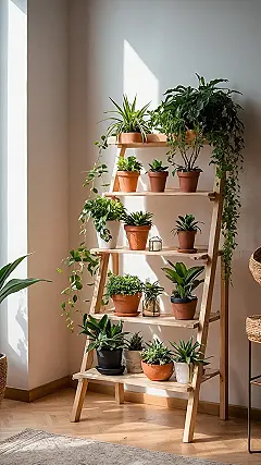 Look at this plant party happening right here! It’s like a whole squad of green pals decided to hang out on that cool ladder shelf, just soaking up the sunbeams and making the room look awesome. Having plants like these indoors isn’t just something your grandparents do anymore; it seriously makes your space feel more alive and way less boring. Check out how they’re all different – some are trying to climb down like little green waterfalls, while others are standing tall like leafy bodyguards. It’s basically turning a corner of your room into a mini, chill jungle hangout.