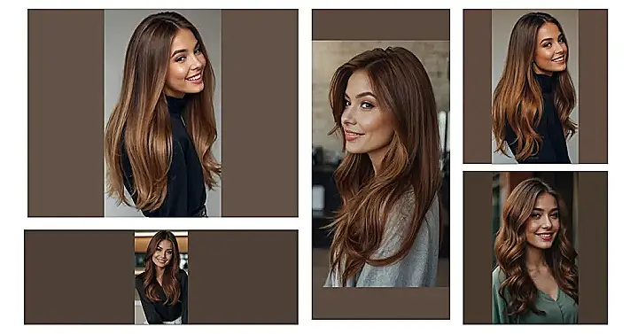 This image shows a gorgeous model with hair that’s like a warm, yummy caramel latte – perfect for fall! It’s a rich brown with some lighter streaks that make it super-dimensional. Imagine walking into school with this hair color – you’d be turning heads for sure!