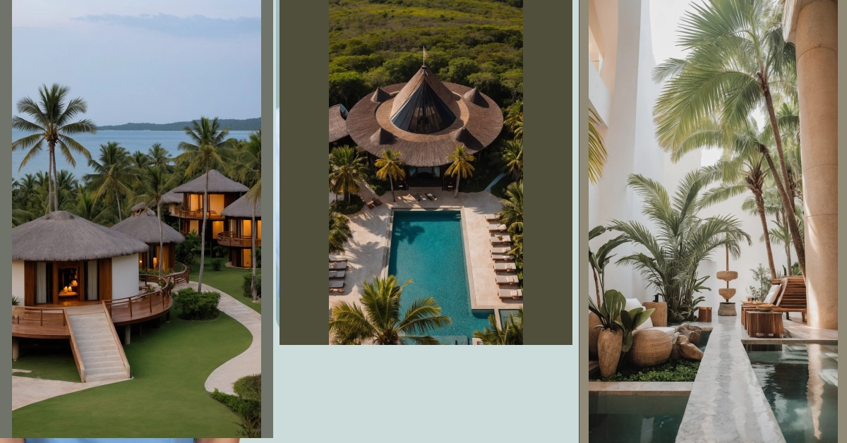Look at this amazing place! It’s like someone decided a giant, perfectly-styled straw hat would make the coolest roof, and honestly, they weren’t wrong. This tropical hotel practically screams ‘vacation mode activated!’ with its laid-back vibe and those tall, spiky palm trees standing guard. You can almost feel the chill breeze and smell the sunscreen just by looking at it – a serious upgrade from your average Monday morning, right?