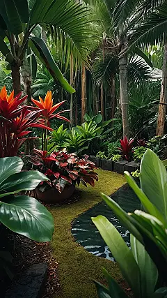 This picture is like a little piece of paradise tucked away in someone’s backyard! It’s a small garden with all the cool stuff you’d find in the tropics – lush green plants, flowers that look like they came straight from a jungle, and even a tiny pond! Imagine chilling out in this little oasis, listening to the sound of water trickling through the rocks and taking a break from the hustle and bustle of everyday life. You can practically feel the warm tropical air, can’t you?