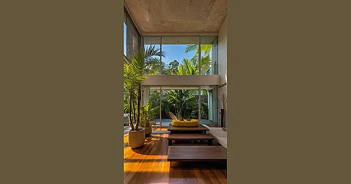 This house isn’t just a home; it’s a vacation waiting to happen! Imagine waking up every morning to the sound of tropical birds (or maybe just your super chill alarm clock) and stepping out onto a lawn so green, it’s practically glowing. The wooden walls and those huge windows give you major “beach bungalow” feels, but the sleek design keeps things totally modern and sophisticated—a perfect mix of laid-back luxury and stylish simplicity. It’s like someone took a tropical island, smashed it with a super-cool architectural blueprint, and voila! Instant paradise.