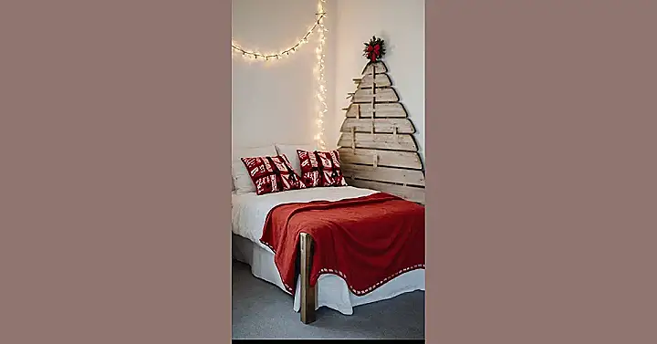 **Paragraph 1:** Wow, check out this bedroom! It’s totally decked out for Christmas, even better than Grandma’s living room (don’t tell her I said that!). Look at that adorable mini-Christmas tree, all sparkly and perfect. And the best part? The wall above the bed is a total Christmas wonderland with a gorgeous garland of greenery, twinkly lights, and wooden Christmas letters spelling out “Christmas.” It’s like walking into a festive movie scene! I’m already dreaming of hot cocoa and gingerbread cookies in this cozy haven.