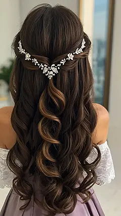 That hair accessory? Totally a tiara-lite! It’s like the cool younger sister of a full-on princess crown, adding just the right amount of bling without looking like you’re about to rule a small country. Plus, all those curls cascading down are like saying, “Yeah, I woke up like this… after spending three hours with a hair stylist!” But hey, looking amazing is hard work!