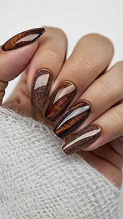 But wait, there’s more sparkle to love! Mixed in with those mystical cat eye nails are some seriously glitter-tastic ones that shimmer like a thousand tiny diamonds decided to throw a party on your fingertips. This whole set, with its mix of shifting gleam and all-out sparkle in warm, cozy brown tones, is basically an invitation for compliments. They look so good snuggled up against that comfy white fabric, making them perfect for chill days or when you want to add a touch of playful glam to any outfit. Talk about a major nail glow-up that’s both fierce and friendly!