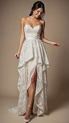 You know that moment when you find *the* outfit that just works for everything? Well, check out this dress! It’s got all the fancy lace and elegance for a fairy-tale wedding – I mean, look at that gorgeous train and the delicate flowers she’s holding! But here’s the secret: with that sassy high-low cut, it’s basically whispering, “Hey, I’m also ready to totally slay at homecoming without tripping on a mile of fabric!” You could probably even convince your grandma it’s a super fancy, modern wedding dress AND then rock it with your besties at the dance without missing a beat. Talk about a double-duty fashion hero!