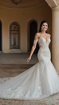 And if you thought mermaid dresses were only for the bold, think again! There are stunning options with a square neck long sleeve that offer just the right amount of refinement. Perfect for those cool evening ceremonies, these dresses combine the allure of a mermaid cut with sophisticated and elegant details that will leave you feeling like a true fashionista!