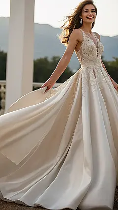 This wedding dress is like a fairytale come to life! Imagine walking down the aisle, feeling like a princess in this gorgeous, flowing gown. It’s got all the dreamy details: delicate lace that looks like it’s sprinkled with tiny pearls, a stunning V-neck that’s totally flattering, and a skirt that’s so full and beautiful, you’ll feel like you’re floating on air. It’s the perfect dress for anyone who wants to feel both elegant and totally comfortable on their big day. No need for a glass slipper—this dress is pure magic all on its own!