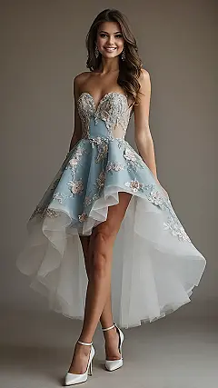 Talk about making an entrance! This gorgeous dress looks like it just stepped out of a magical garden party and straight onto the dance floor. With its pretty sky-blue color and those adorable pink flowers blooming all over, it’s practically begging for a compliment. Plus, that super cool high-low hem means you get all the fancy vibes of a long dress in the back, but you can actually move your legs and dance without tripping in the front. No more awkward shuffles when your favorite song comes on, just pure, unadulterated spinning!