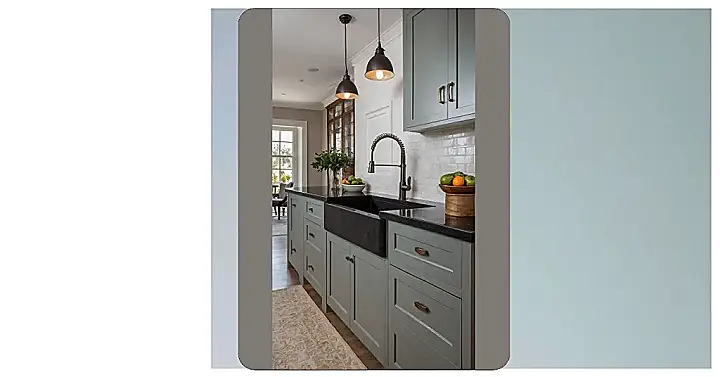This kitchen looks like it stepped right out of a magazine, probably one your parents read while you’re secretly scrolling TikTok. Those sage green cabinets and the super cool dark sink give off major “I’ve got my life together” vibes, even if the only thing you’re making is instant noodles. It’s the kind of designer kitchen where you almost feel bad leaving a crumb, but that giant springy faucet probably makes dish duty feel like a superhero mission.