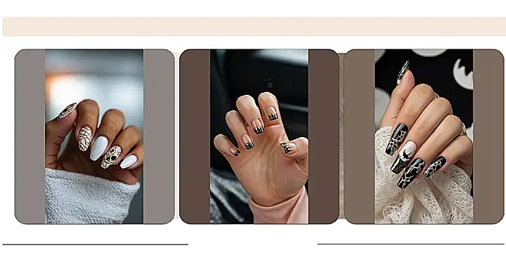 And let’s talk about that one nail that really pops – the one with the wicked white design! It looks like some ancient, gnarled roots reaching out or perhaps even stylish, spooky bones emerging from the darkness, giving a truly eerie yet artistic vibe. If you’ve been scrolling for Halloween nail inspiration that’s truly unique and definitely not boring, these long, coffin-shaped beauties are here to make your spooky season extra special. Time to get inspired and show off your own fabulous, fear-inducing fingertips!