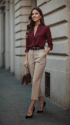 Thinking about grown-up jobs might seem far away, but getting your corporate girlie style sorted is basically like leveling up your fashion game! Look at this outfit – that maroon top and sharp trousers are saying “I mean business,” but also “I’m totally put together.” It’s less about hiding under a huge hoodie and more about rocking clothes that make you feel like you could solve complicated math problems *and* still look fabulous doing it. Plus, trading in your sneakers for those cool heels? That’s a whole different kind of athletic challenge, probably involving fewer sprints and more graceful wobbles.
