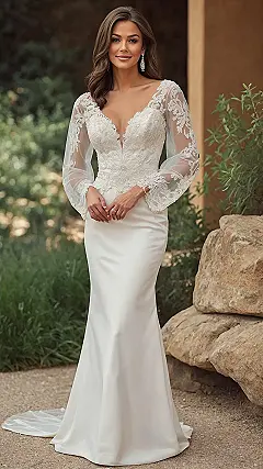 Choosing wedding dresses with sleeves is basically a genius move for any bride who wants to look amazing without constantly shrugging her shoulders or worrying about goosebumps. Think about it: these beautiful lacy sleeves mean you can flawlessly pull off all your celebratory dance moves, hug Aunt Carol for the tenth time, and still look like a queen without a single ‘brrr!’ Plus, the intricate lace on this dress proves sleeves are anything but boring – they add a whole extra layer of ‘wow’ that’s totally picture-perfect, whether you’re posing in a field or doing the cha-cha slide.