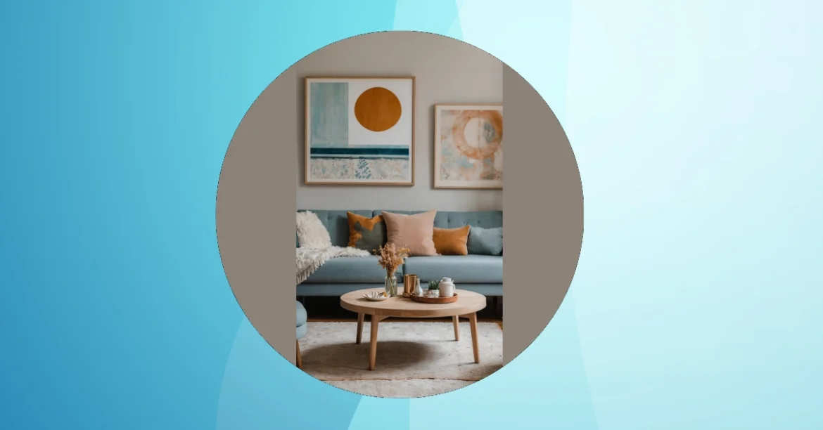 Step into this living room and you just know it’s got a cool beat! It’s not your average matchy-matchy space; those colours are having a little party – the calm blue couch hanging out with funky orange and pink pillows feels totally unique. And seriously, look at that art! It looks like abstract sunshine and cool blue vibes are teaming up on the wall. It all comes together to give the room that easygoing, slightly quirky ‘funky’ feel, like it’s ready for some good tunes and comfy lounging.