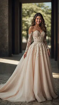 Beyond its epic length, this gown is a masterpiece of design with all that intricate lace detailing on the sleeves and bodice. It practically screams, “I’m here to slay, but also, I’m super comfy… probably!” The dreamy, soft color makes you look like you just stepped out of a fairy tale where everyone gets a perfect hair day. Who needs a magic wand when your long gown makes you feel like the main character? Just remember to practice your twirls – this dress was definitely made for a grand entrance (and maybe a dramatic exit, too!).