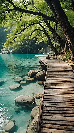 This picture practically yells, “Drop your textbooks and come chill!” That water right there? It’s so incredibly clear, you could probably spot a tiny mermaid having a tea party with a fish. The vibrant turquoise is so inviting, it’s like Mother Nature decided to mix a giant batch of her best tranquilizer cocktail, but for your eyes. That cool wooden boardwalk? It’s totally begging for you to take a slow stroll, leaving all your stress somewhere back in your locker. This whole scene is basically a giant, calming hug from the internet, perfect for when your screen needs a serious dose of zen.