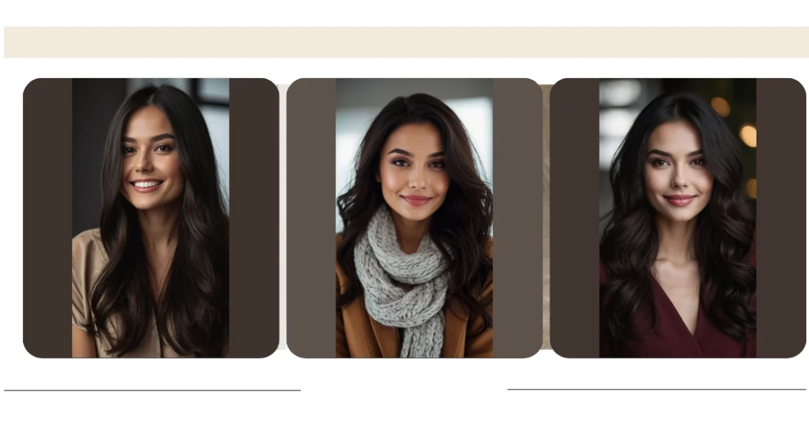 This picture shows a gorgeous example of “dark winter hair color.” It’s like the model is wearing a luxurious, dark chocolate waterfall—except it’s attached to her head! Seriously though, those luscious locks are amazing. It’s the kind of hair that makes you want to run your fingers through it (but don’t do that without asking first!). It’s the perfect hair for anyone who wants to look mysterious and chic, like a super cool secret agent, or a total rock star—without even trying!