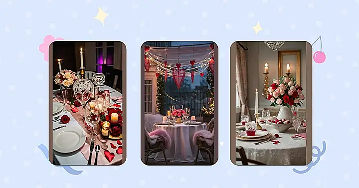 This Valentine’s Day table setting is seriously #relationshipgoals! Imagine the look on your date’s face when they see this gorgeous arrangement of pink and red roses. It’s like a fairytale come to life—all those pretty petals scattered on the table, the candlelight casting a warm glow, and those delicious-looking drinks. Forget chocolates; this is the ultimate romantic treat, and way more impressive than anything you’ll find at the store!