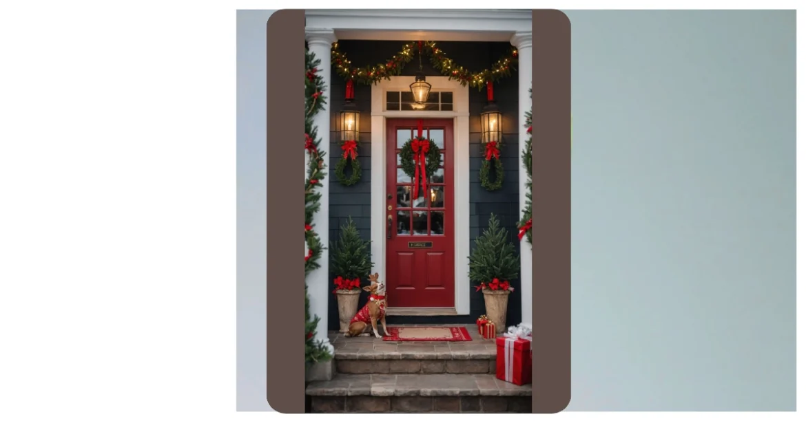But let’s be real, the true star of this outdoor Christmas spectacle isn’t the fancy wreath or the perfectly wrapped presents sitting on the steps. Nope, it’s the tiny, majestic creature rocking reindeer antlers and a snazzy Christmas sweater. This little guard dog, or perhaps ‘Reindog,’ seems to be taking its role very seriously, probably wondering if those gifts are for him or if he’ll have to bark at any carolers who sing off-key. He’s probably thinking, “All this festive fabulousness, and I still haven’t sniffed out where they hid the bacon treats.” He’s definitely earned a spot on the ‘nice’ list, and probably a few extra belly rubs for looking so darn adorable.
