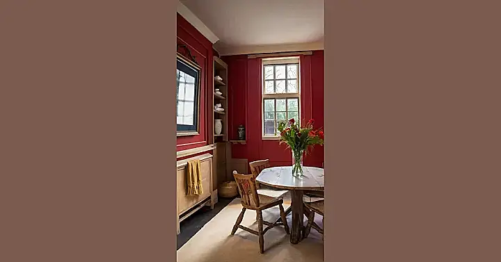 This room is seriously rocking the red! Imagine having dinner here – surrounded by rich, crimson walls that practically hum with cozy vibes. The flowers in the vase are like a burst of sunshine, adding a pop of color that prevents things from feeling too dramatic. It’s like a secret club for people who appreciate sophisticated redness, and anyone can join! That comfy-looking rug adds just the right touch to make sure it isn’t too much like a vampire’s lair.