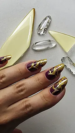 It’s a super cool nail design that’s totally unique. The gold and purple together make it look like something from a fantasy movie. It’s like a scorpion’s armor, but instead of sharp claws, you have these pretty little swirly details. Imagine walking into a party with these nails, everyone would be like, “Wow, those are amazing! Where did you get them?” You’d be the queen bee, the nail queen, the *scorpion* queen! Yeah, they’re that cool.