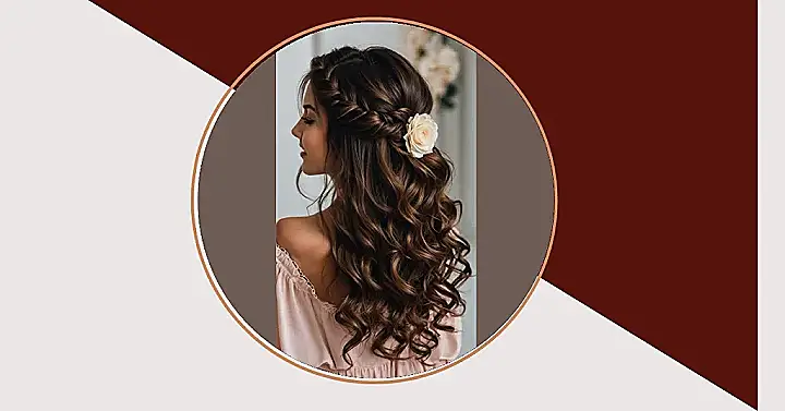 Wow, just look at this stunning hairstyle! It’s got that cool braid that wraps around all fancy-like, and then those perfect waves tumbling down like a chocolate waterfall. Honestly, if my hair did this, I’d probably just wear a paper bag over my face for the rest of the day so people would only focus on the amazing hair. And that flower? It’s like the crown jewel on this masterpiece. Trying to recreate this might take a village and three cans of hairspray, but a girl can dream, right?