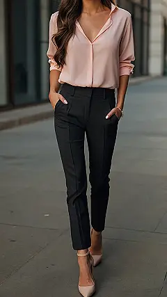 Now, while this outfit screams “boss babe,” it’s also totally doable. You probably already have pants like these in your closet, and finding a flowy pink shirt is easier than finding your lost AirPods. Plus, with the shirt tucked in, you’re ready for anything – from important meetings to grabbing coffee with your work bestie.