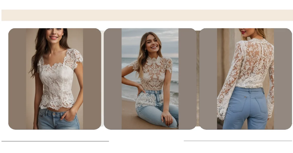 You can almost hear this outfit saying, “I’m ready for a fancy brunch, a library study session, or maybe just binge-watching my favorite show with a super fancy snack.” The way the detailed lace perfectly balances out those comfy denim jeans means you’re not over-dressed or under-dressed – you’re just right, like Goldilocks found her fashion sweet spot. Plus, that happy smile on the model? Pretty sure it’s because she knows she found the cheat code to looking amazing without sacrificing her snack budget for a ball gown. Score!